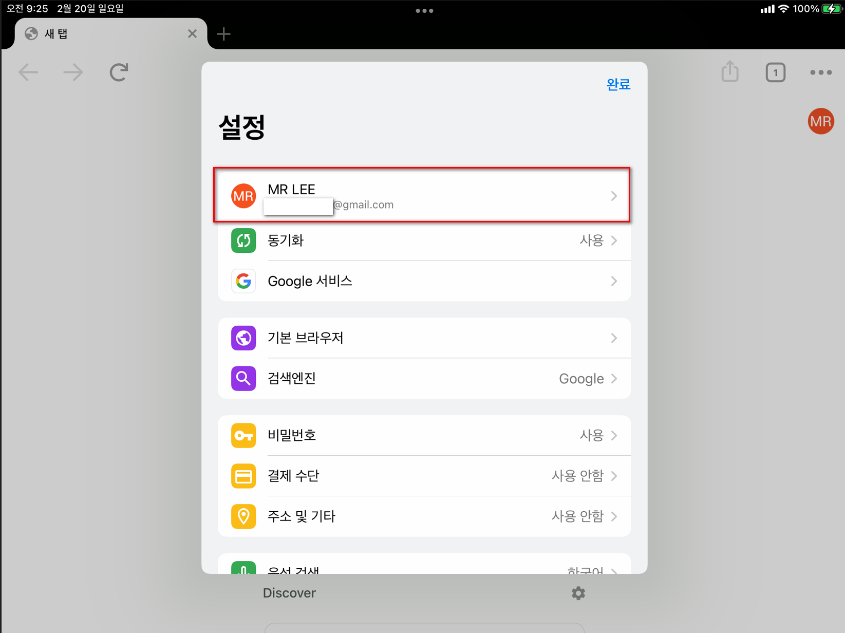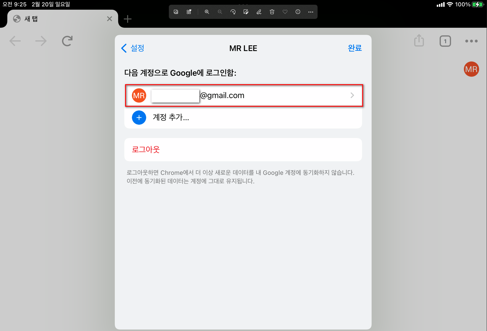 애플기기의 크롬에서는 로그인 순서가 기본 계정을 설정하는 것 같다.
